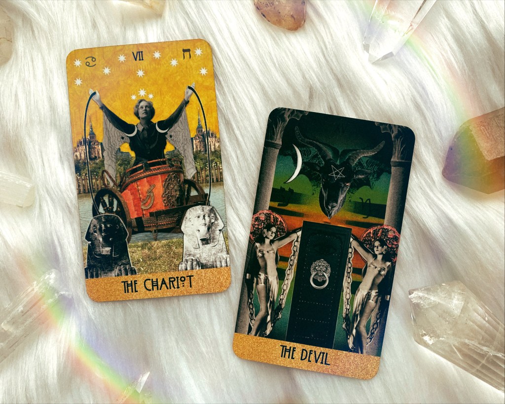 In the Chariot, a woman is holding onto reins as she embarks on a journey; the Devil card features women who appear to be chained against their will. Each of these cards represent an element of flow and control and our relationship to both.